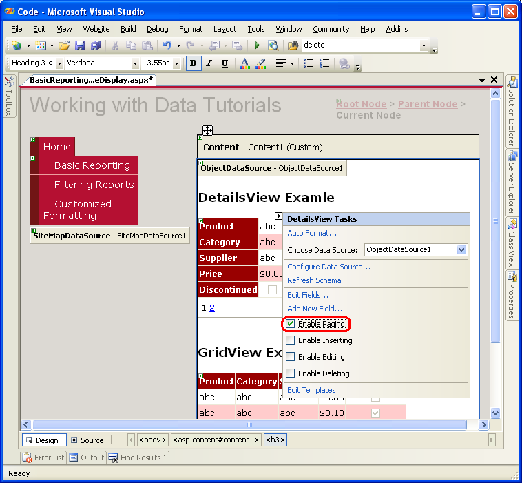 Tenga en cuenta que DetailsView solo muestra el primer registro devuelto por su origen de datos. Para permitir que el usuario recorra todos los registros, de uno en uno, debemos habilitar la paginación para DetailsView. Para ello, vuelva a Visual Studio y active la casilla Habilitar paginación en la Etiqueta Inteligente DetailsView.