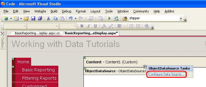 Para especificar el objeto subyacente de ObjectDataSource y cómo se asignan los métodos de ese objeto a objectDataSource, haga clic en el vínculo Configurar origen de datos desde la etiqueta inteligente objectDataSource.