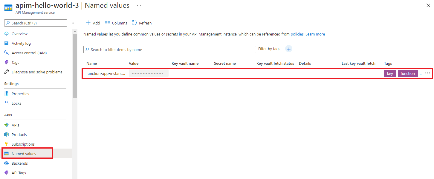 Vaya a la instancia de API Management y seleccione API>Valores con nombre en el panel izquierdo. La clave de la aplicación de funciones de Azure se almacena allí.