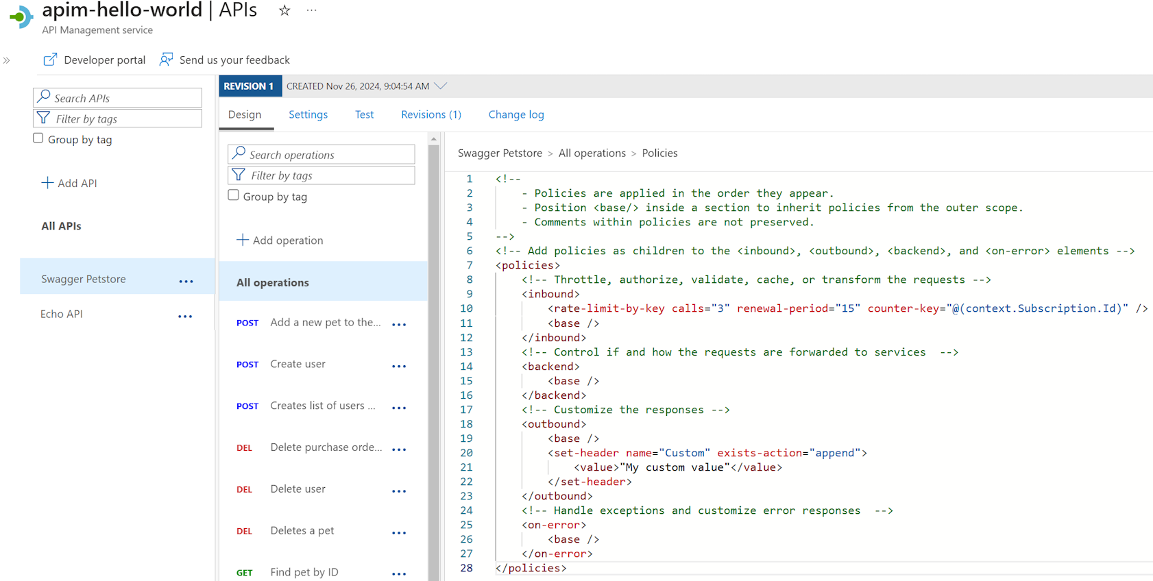 Por ejemplo, es posible que quiera establecer un encabezado de respuesta personalizado. O bien, configure una directiva de límite de velocidad para proteger la API de back-end, por lo que los desarrolladores no sobrecargan la API. Estos ejemplos son una introducción sencilla a las directivas de API Management. Para obtener más opciones sobre la directiva, consulte Directivas de API Management.