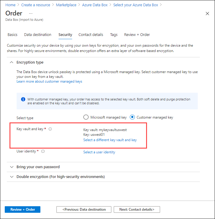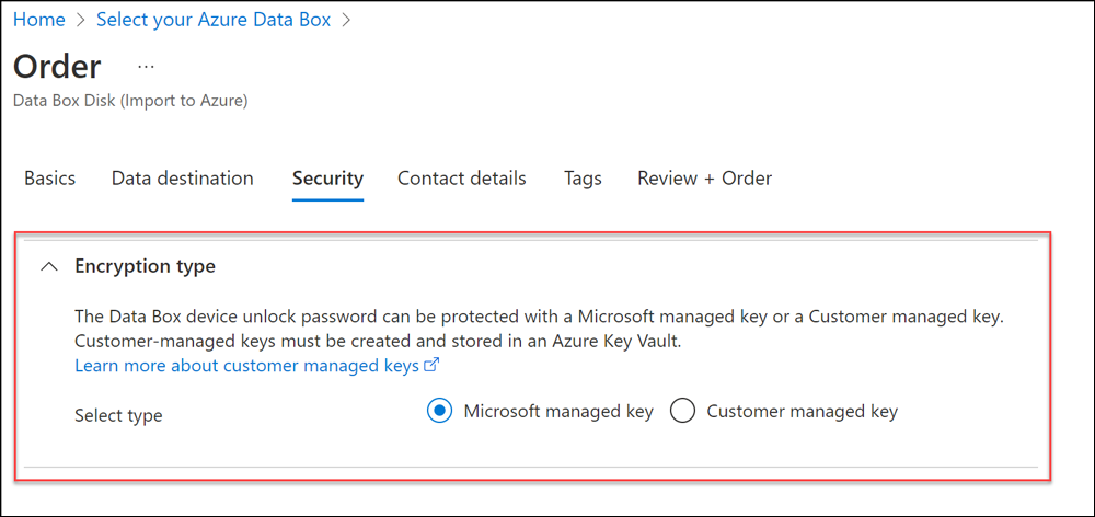 La configuración de una clave administrada por el cliente para Azure Data Disk es opcional. De manera predeterminada, Data Box usa una clave administrada por Microsoft para proteger la clave de paso de desbloqueo.