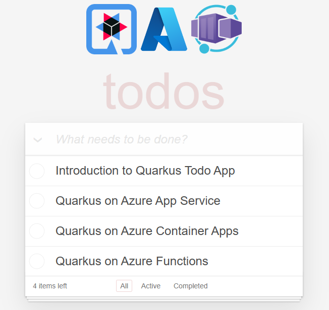 En este artículo se muestra cómo implementar rápidamente Red Hat Quarkus en Microsoft Azure Container Apps con una sencilla aplicación CRUD. La aplicación es una "lista de tareas pendientes" con un front-end de JavaScript y un punto de conexión REST. El servidor flexible de Azure Database for PostgreSQL proporciona la capa de persistencia para la aplicación. En el artículo se muestra cómo probar la aplicación localmente e implementarla en Container Apps.