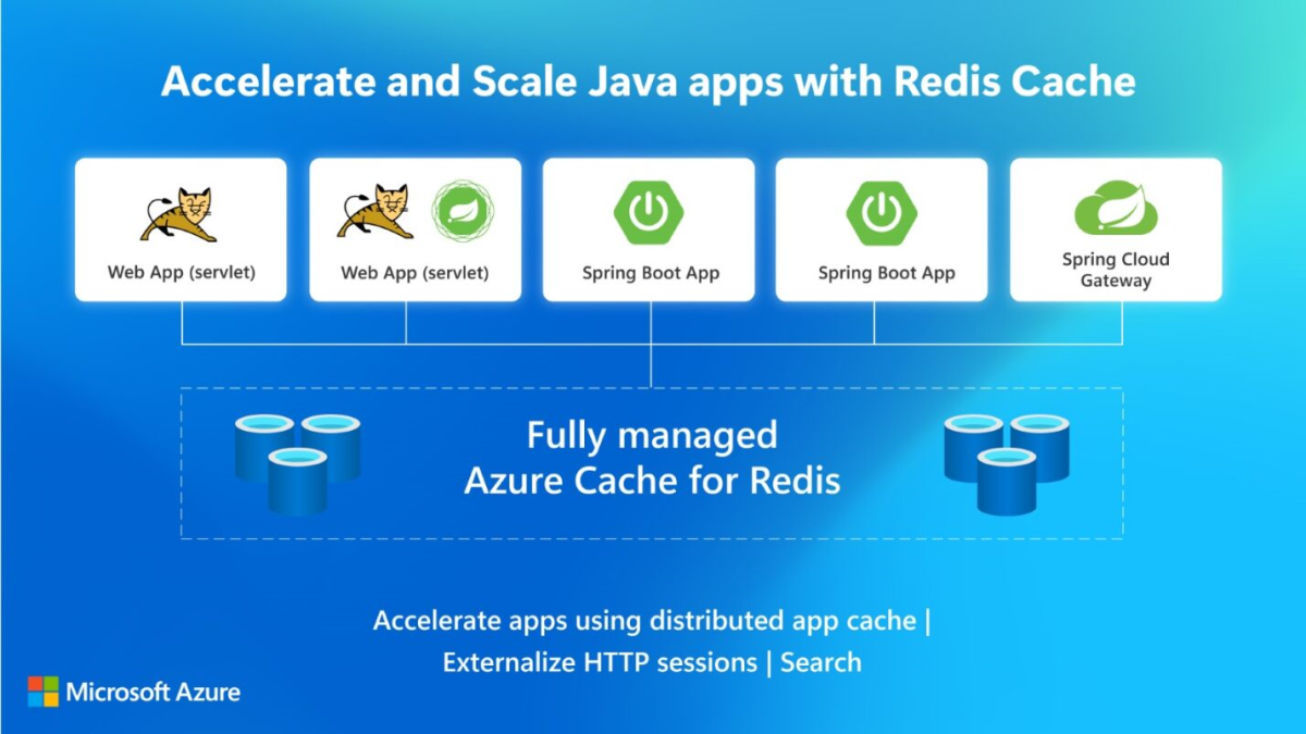 A medida que aumentan las cargas de trabajo de las aplicaciones Java, puede incrementar el rendimiento mediante Azure Cache for Redis para implementar una capa de almacenamiento en caché en memoria para los resultados de las consultas, los estados de sesión y el contenido estático. Es una manera estupenda de mejorar el rendimiento de la aplicación y reducir la latencia sin tener que rediseñar la base de datos subyacente. Los niveles Enterprise de Azure Cache for Redis, desarrollados en colaboración con Redis y totalmente administrados por Microsoft, son la opción de implementación más altamente disponible y escalable para ejecutar Redis en Azure. Incluye características como la replicación geográfica activa, la administración de sesiones externalizadas y la búsqueda y la indexación de alta velocidad.
