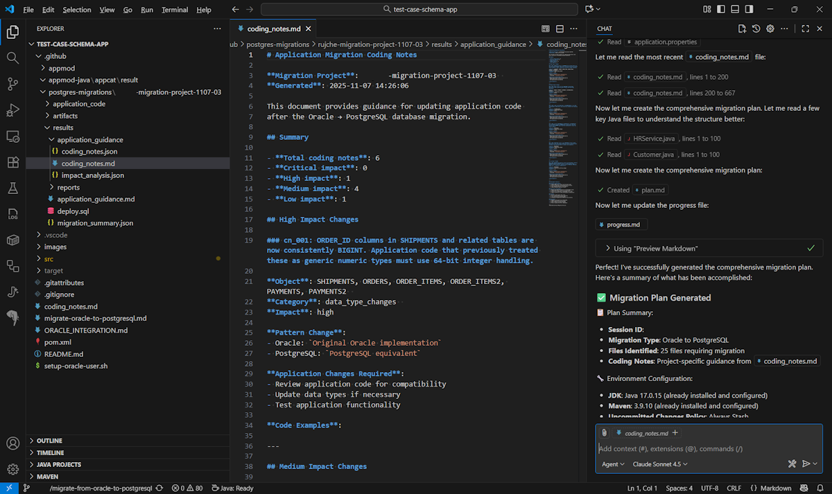 coding_notes.mdestá presente en la.github\postgre-migrations\*\results\application_guidance\carpeta . Si no está presente, vaya al equipo de base de datos responsable de la migración de Oracle a PostgreSQL para obtenerla y colóquela en la misma estructura de carpetas.A continuación, seleccione Ejecutar tarea para ejecutar la migración. Si se colocan correctamente las notas de codificación, la modernización de aplicaciones hace referencia a estas notas para generar una conversión sql de mayor calidad, así como la actualización del cliente de base de datos mediante la autenticación de identidad administrada. De lo contrario, la conversión aplica ajustes generales de sintaxis de Oracle a PostgreSQL para proponer cambios.