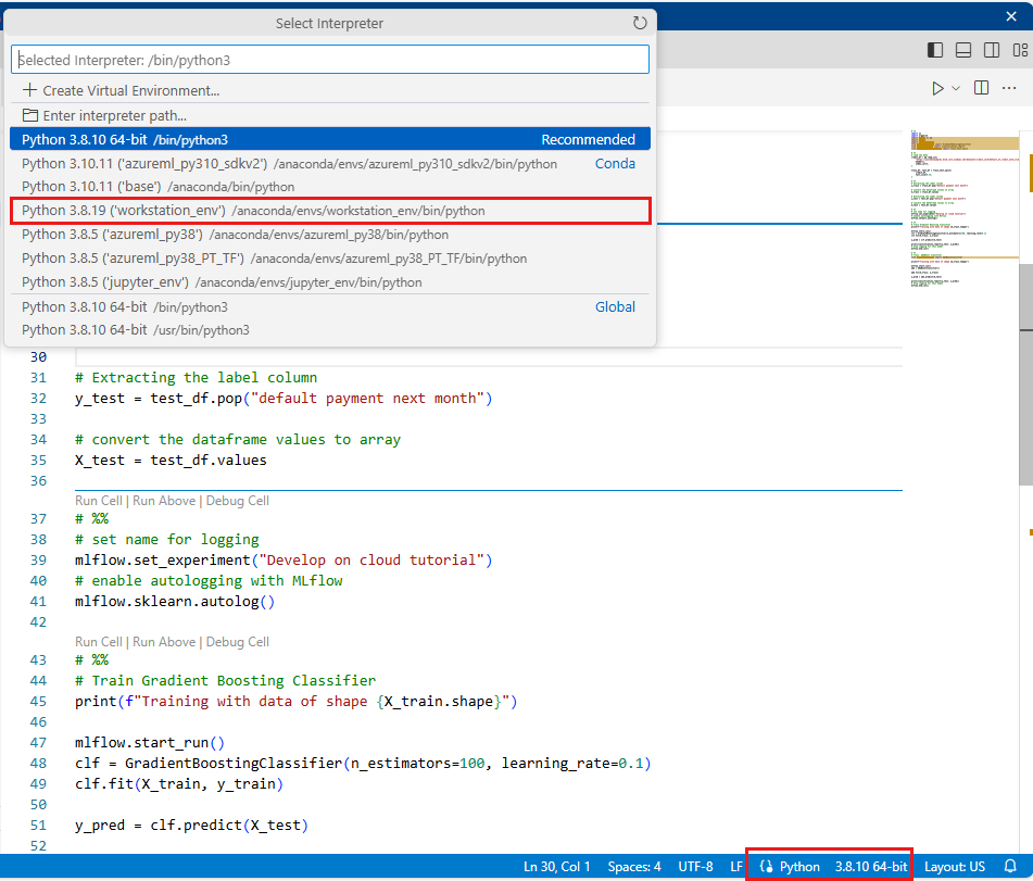 Seleccione el entorno que creó anteriormente en este tutorial como versión de Python (workstations_env). En la esquina inferior derecha del cuaderno, verá el nombre del entorno. Selecciónelo y, a continuación, seleccione el entorno en la parte superior de Visual Studio Code.