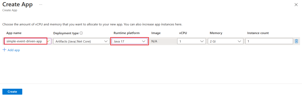 En la página Crear aplicación, para el nombre de la aplicación, utilice simple-event-driven-app y deje todos los demás campos con sus valores predeterminados.