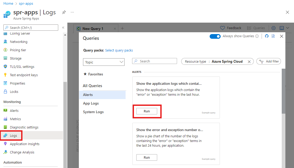 En el panel Consultas bajo Mostrar los registros de aplicación que contienen los términos "error" o "excepción", seleccione Ejecutar.