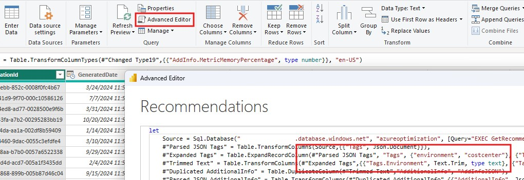 AOE incluye un informe de Power BI para visualizar recomendaciones. Para usarlo, primero debe cambiar la conexión del origen de datos a la Base de Datos SQL que desplegó con el AOE. En el menú superior de Power BI, seleccione Transformar configuración del origen de datos