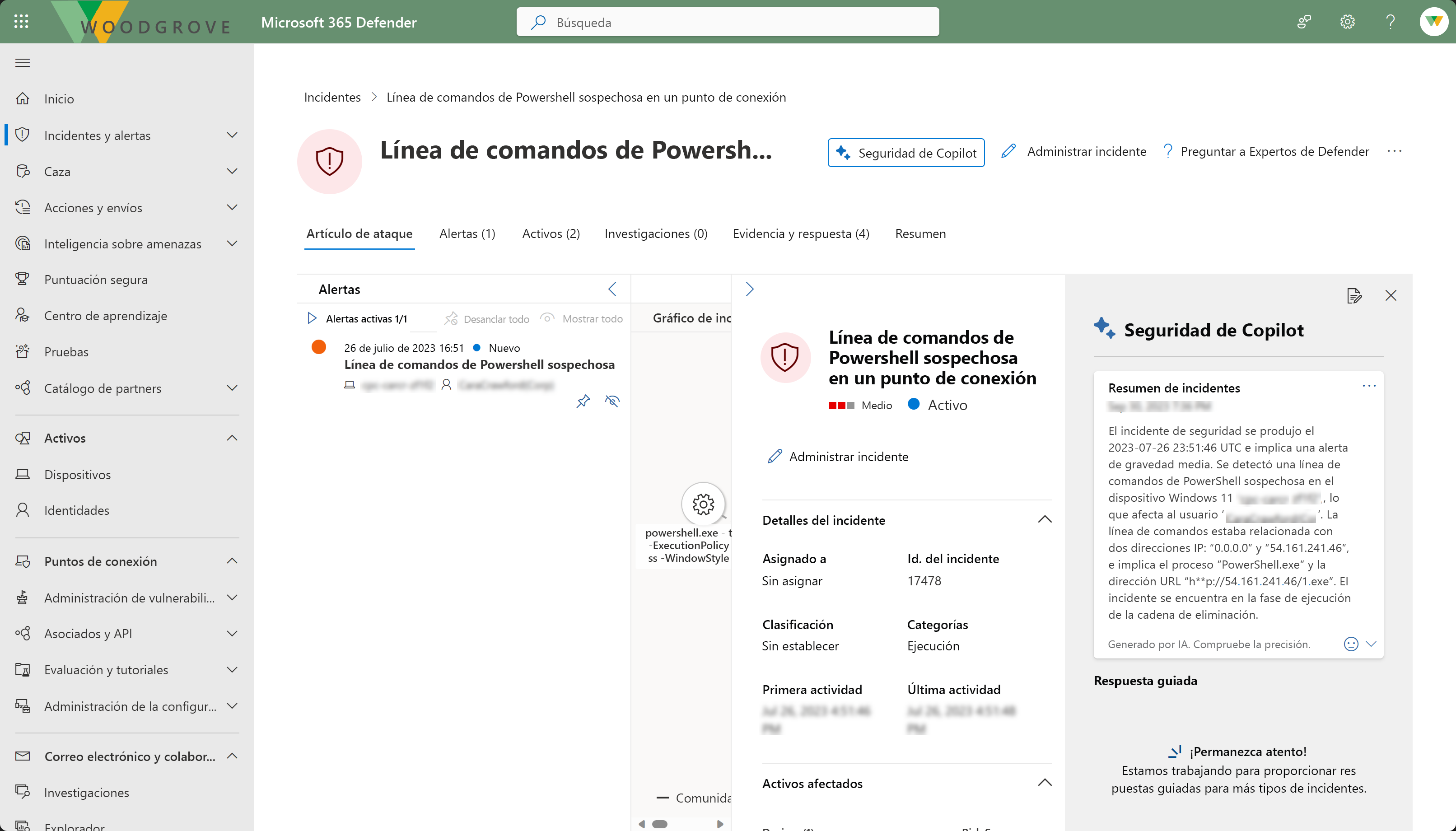 En este ejemplo, Security Copilot se usa para realizar una investigación completa de incidentes mediante la recopilación de información contextual de alertas, el análisis de un script sospechoso y la generación de una evaluación acompañada de un conjunto de pasos de corrección.