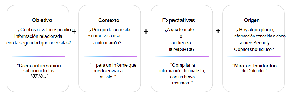 Las solicitudes eficaces proporcionan Security Copilot parámetros adecuados y útiles para generar una respuesta valiosa. Los analistas o investigadores de seguridad deben incluir los siguientes elementos al escribir una indicación.