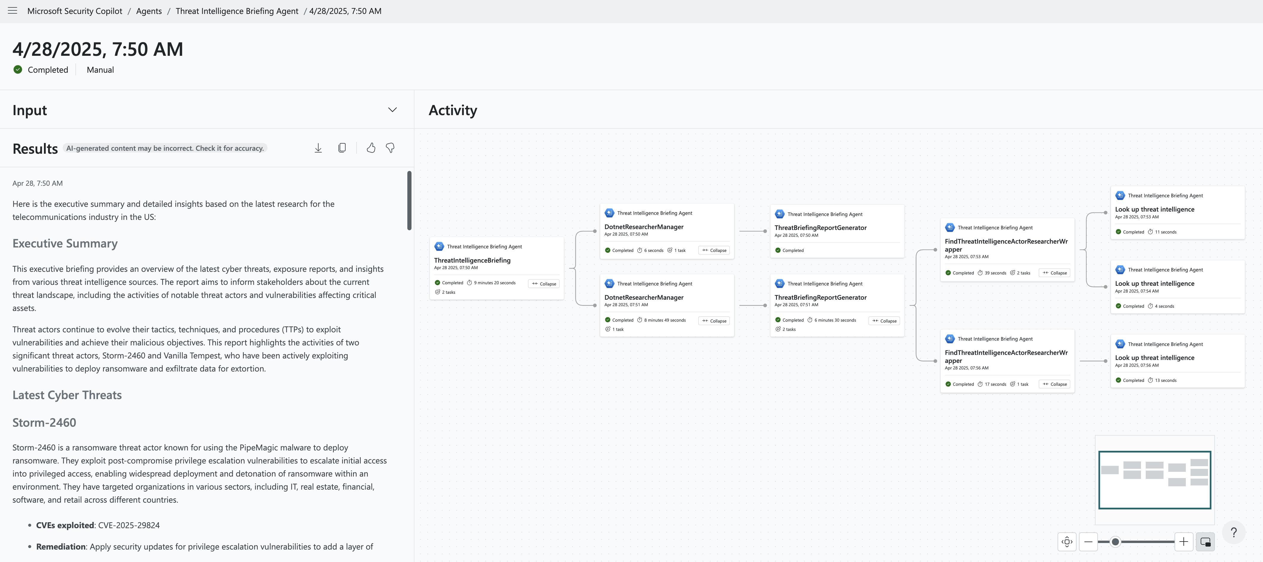 Threat Intelligence Briefing Agent elige dinámicamente el siguiente paso en función del resultado del paso anterior a medida que compila la sesión informativa. Para ver el progreso del agente hacia la generación de la información sobre amenazas, seleccione Ver actividad.