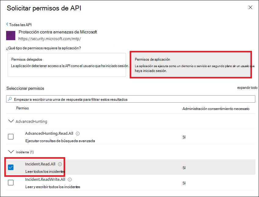 Incidents.Read.Allpermisos ,Incidents.ReadWrite.AllyAdvancedHunting.Read.All:
