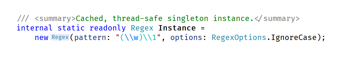 La implementación generada de AbcOrDefGeneratedRegex() almacena en caché de forma similar una instancia singleton Regex, por lo que no se necesita almacenamiento en caché adicional para consumir código.