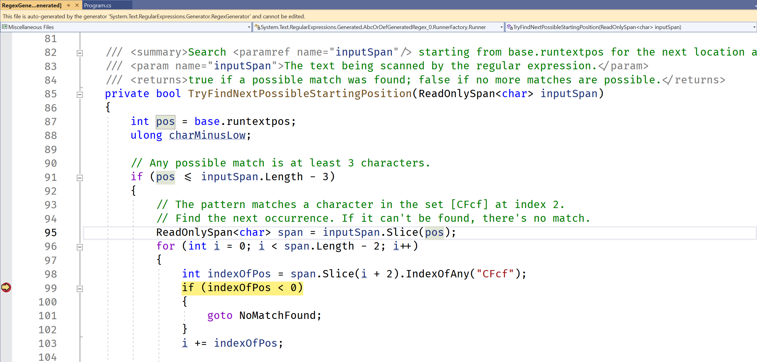 Pero, como se puede ver, no solo está haciendo new Regex(...). En su lugar, el generador de código fuente emite en código de C# una implementación derivada de Regex personalizada con una lógica similar a la que RegexOptions.Compiled emite en IL. Se obtienen todas las ventajas de rendimiento de RegexOptions.Compiled (más, de hecho) y las ventajas de inicio de Regex.CompileToAssembly, pero sin la complejidad de CompileToAssembly. El código fuente que se emite forma parte del proyecto, lo que significa que también es fácil de ver y depurar.