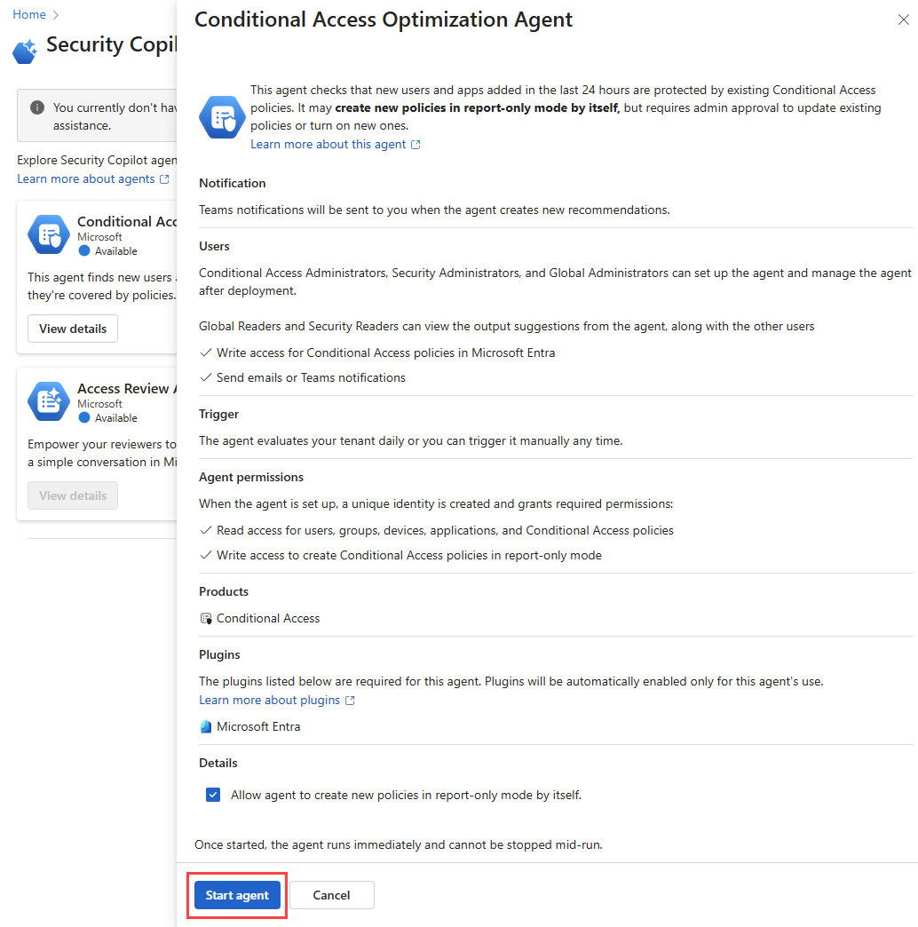 - Puede asignar a los administradores de acceso condicional acceso a Security Copilot, lo que también les permite usar el agente.