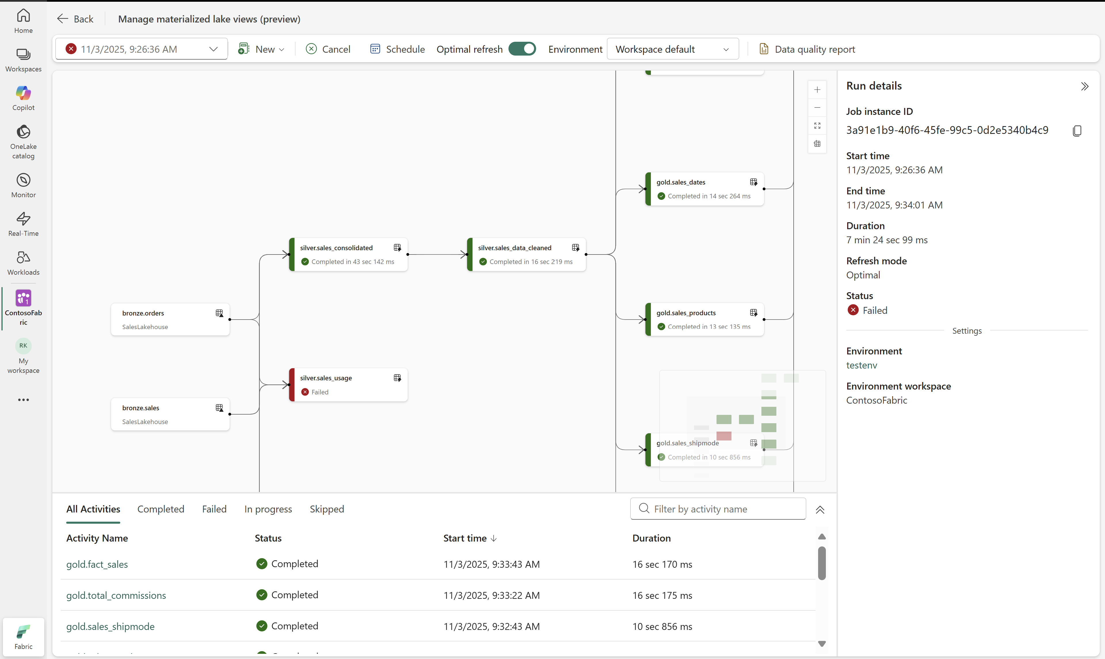 Ejecute todas las celdas del cuaderno mediante Spark SQL para crear vistas de lago materializadas con restricciones de calidad de datos. Una vez que todas las operaciones se hayan ejecutado correctamente, actualice el origen de SalesLakehouse para ver las vistas materializadas del lago recién creadas para los esquemas silver y gold.