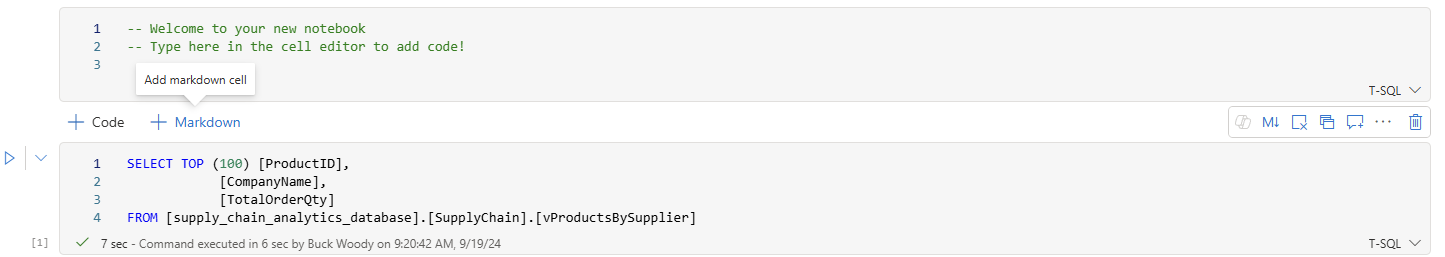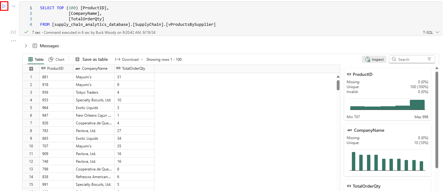 Con esto se crea una celda con código T-SQL que tiene las instrucciones rellenadas de antemano de forma automática. Seleccione el botón Ejecutar celda para que la celda ejecute la consulta y devuelva los resultados.