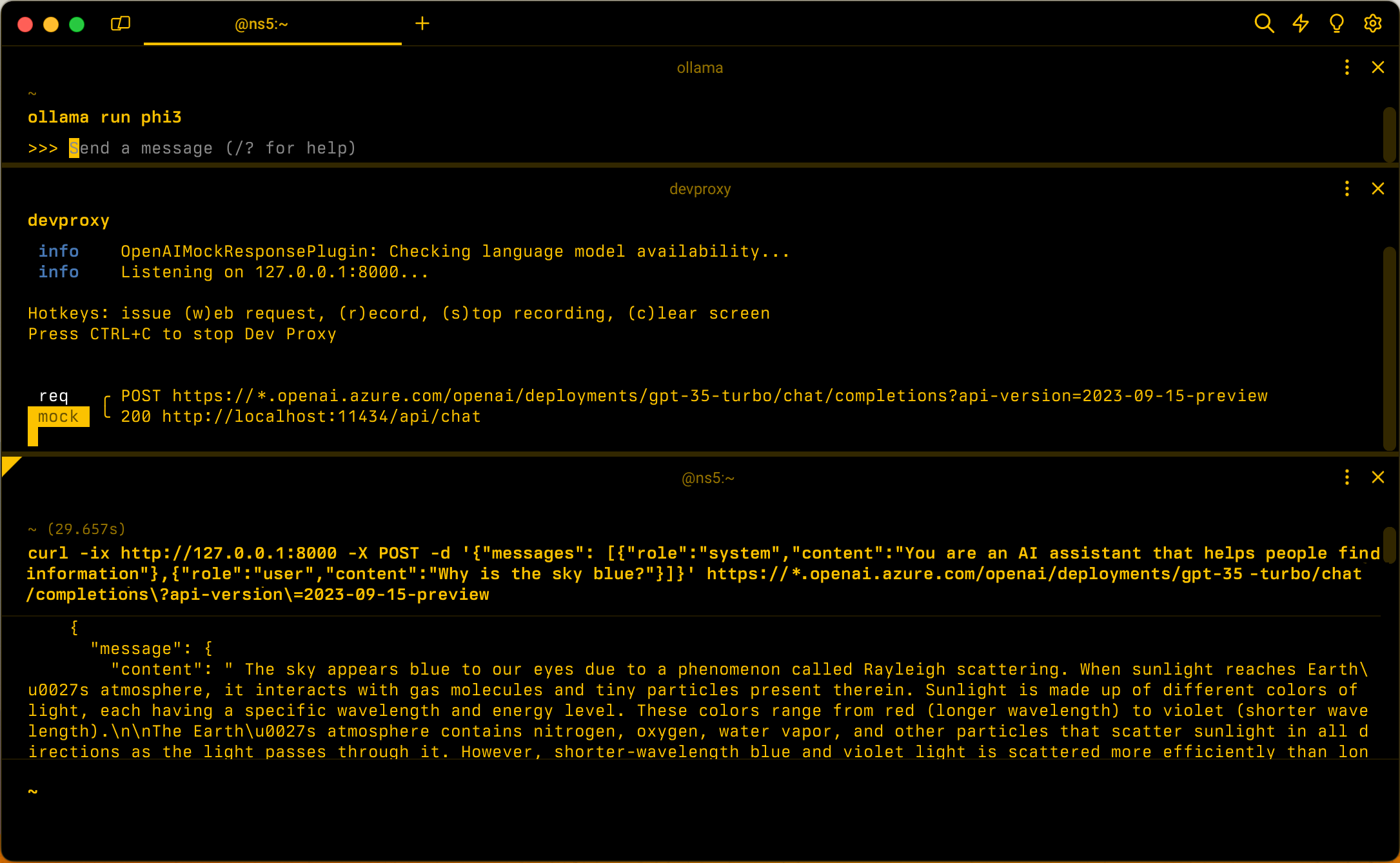 Ejecute la aplicación y realice solicitudes a la API de Azure OpenAI. Dev Proxy intercepta las solicitudes y simula las respuestas mediante el modelo de lenguaje local.
