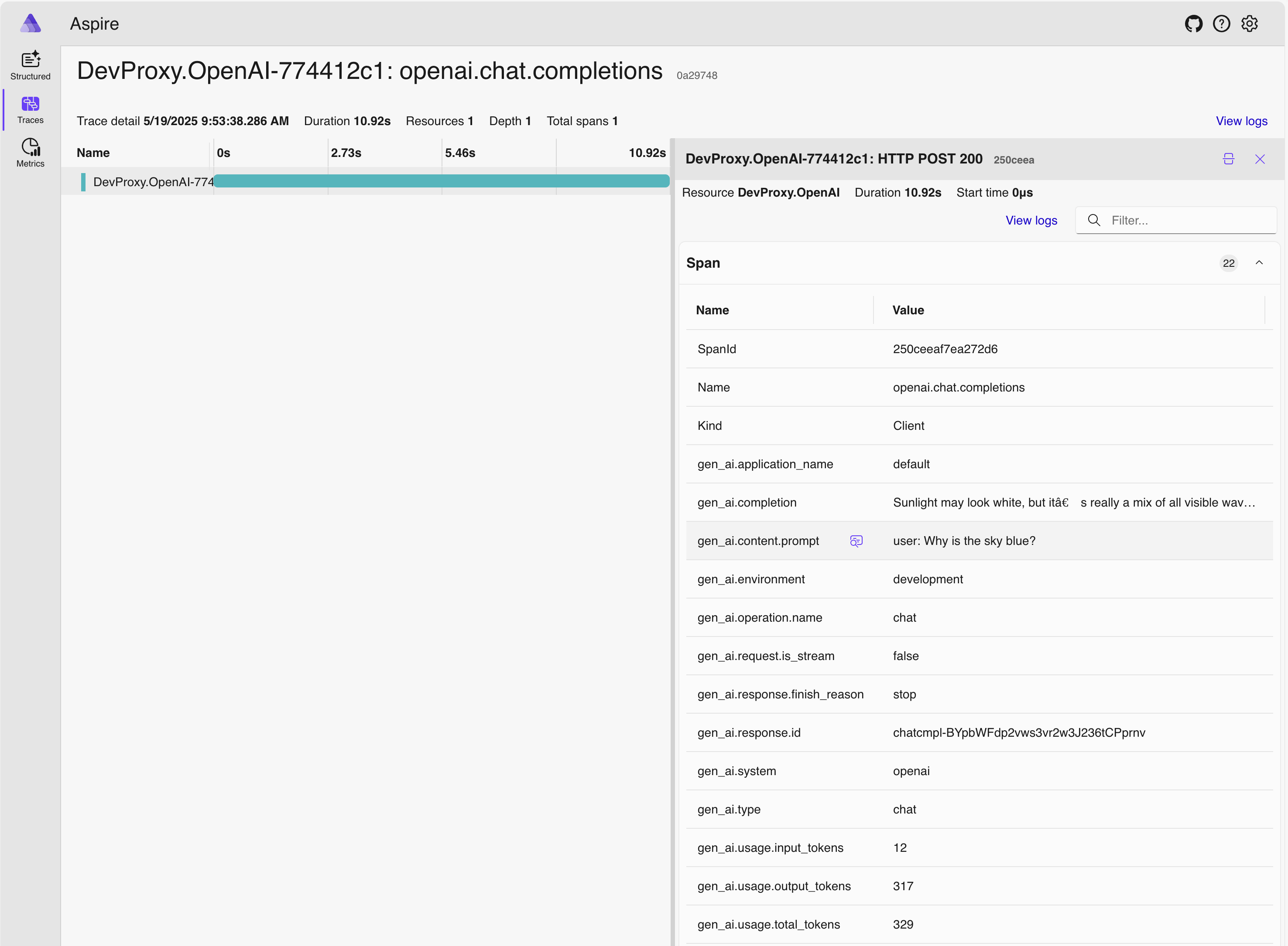 info Dev Proxy API listening on http://127.0.0.1:8897... info Dev Proxy listening on 127.0.0.1:8000... Hotkeys: issue (w)eb request, (r)ecord, (s)top recording, (c)lear screen Press CTRL+C to stop Dev Proxy req ╭ POST https://some-resource.cognitiveservices.azure.com/openai/deployments/some-deployment/chat/completions?api-version=2025-01-01-preview time │ 19/05/2025 07:53:38 +00:00 pass │ Passed through proc ╰ OpenAITelemetryPlugin: OpenTelemetry information emittedEn el explorador web, vaya al panel OpenTelemetry.