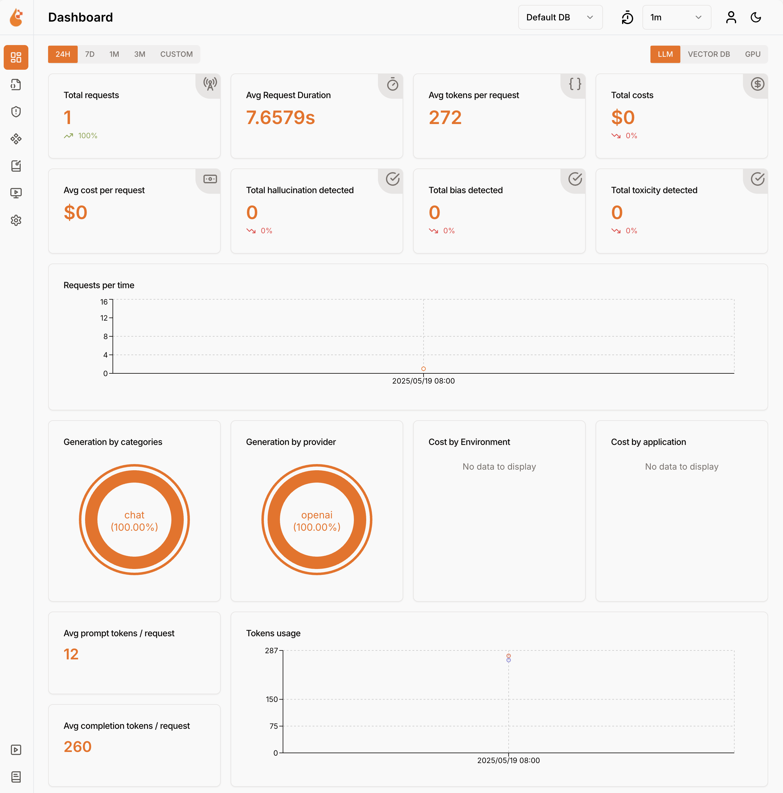 Dev Proxy registra los datos de uso del modelo de lenguaje en formato OpenTelemetry. Puede usar cualquier panel compatible con OpenTelemetry para visualizar los datos. Por ejemplo, puede usar el panel de .NET Aspire o OpenLIT. Los datos de telemetría incluyen el número de tokens usados en la solicitud y la respuesta, el costo de los tokens usados y el costo total de todas las solicitudes durante una sesión.