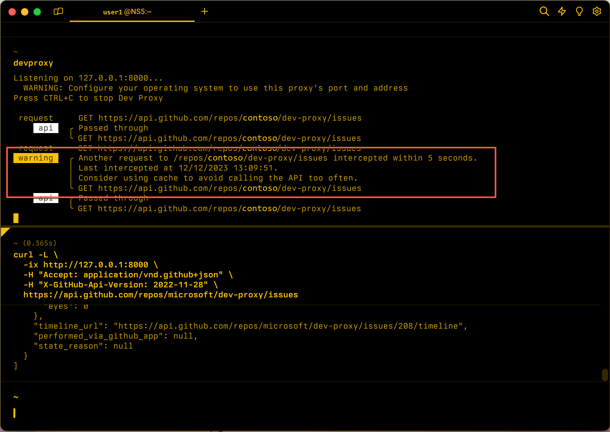 Muestra una advertencia cuando dev Proxy interceptó la misma solicitud dentro del período de tiempo especificado.