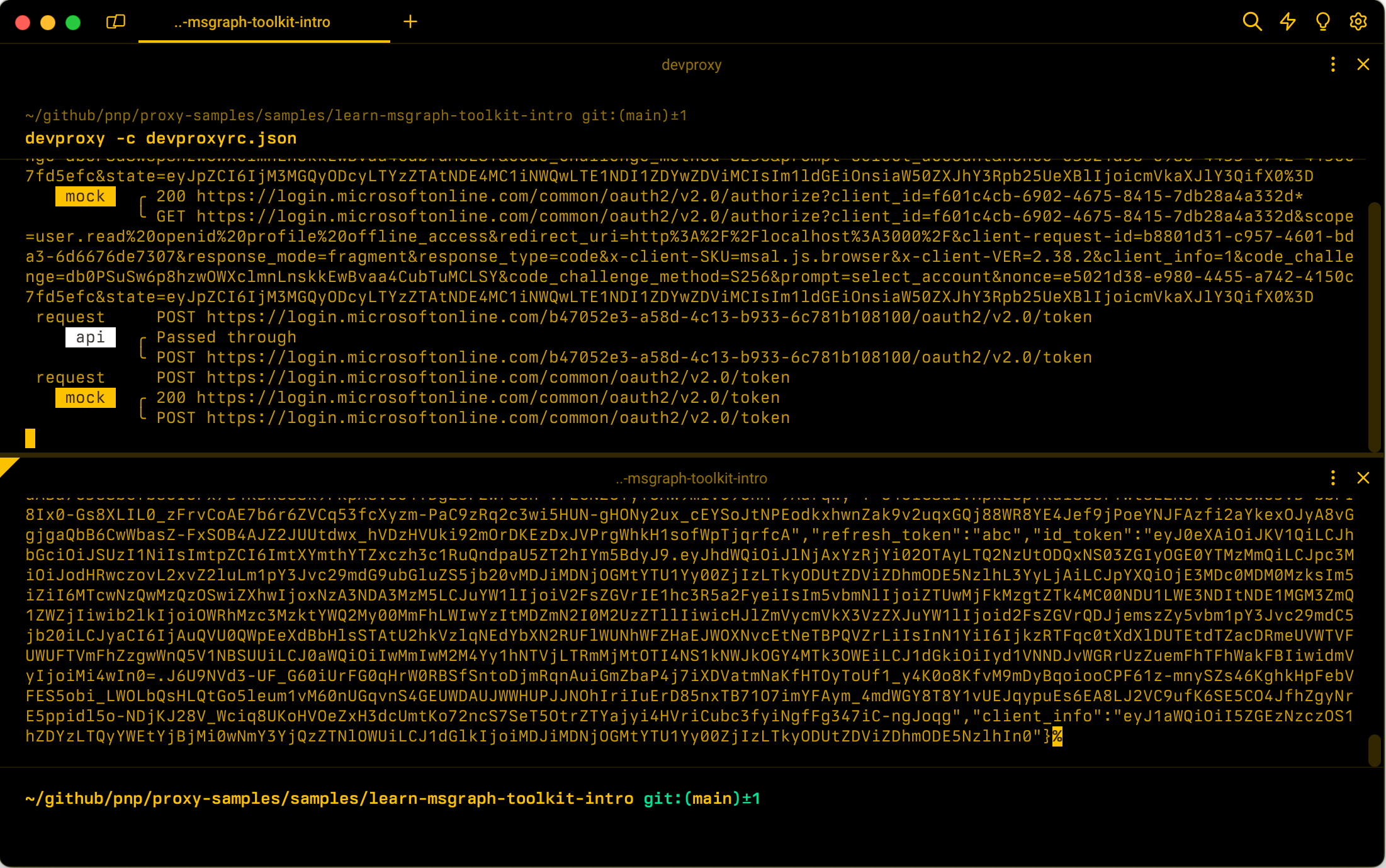 Token de identificador ficticio. Dev Proxy quita el token de @dynamic. y actualiza el valor de la notificación de nonce en el token de identificador ficticio. |