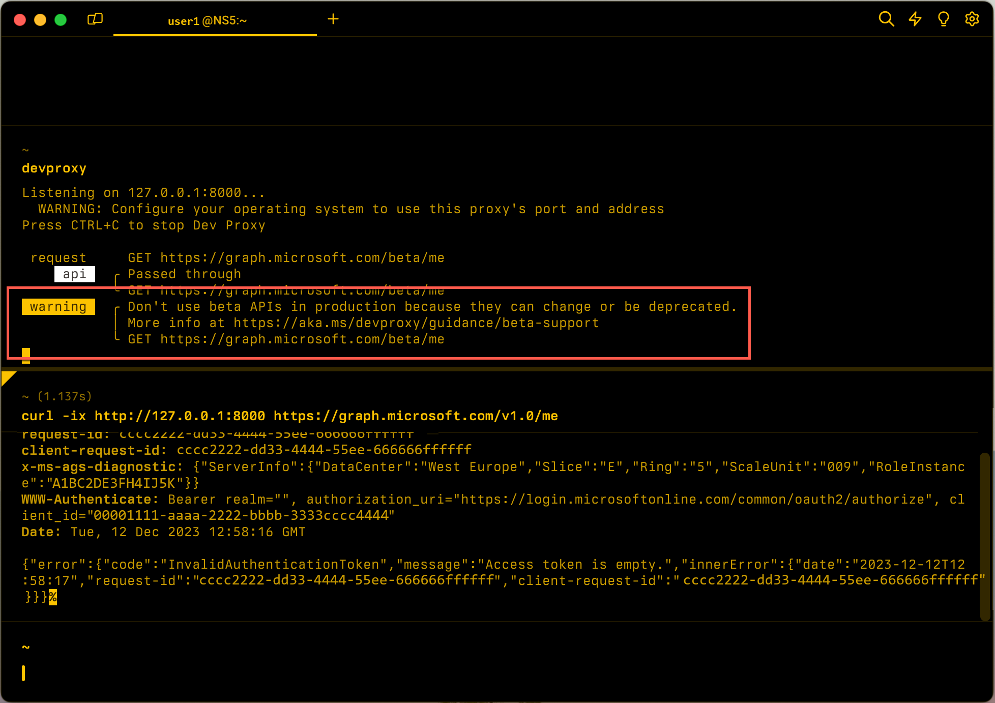 Muestra una advertencia cuando el proxy detecta una solicitud al punto de conexión beta de Microsoft Graph.