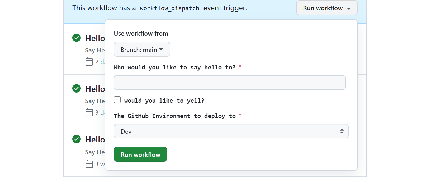 Afortunadamente, la mayoría de los sistemas de CI, como Acciones de GitHub y Azure Pipelines, tienen la capacidad de configurar un flujo de trabajo con entradas que puede desencadenar manualmente a través de sus INTERFACES de usuario o CLIs. Dado que es probable que los desarrolladores y los roles de operaciones relacionados ya estén familiarizados con estas experiencias de usuario, los desencadenadores manuales pueden complementar el patrón de todo como código para habilitar la automatización de actividades (o trabajos) que no tienen una representación de archivo natural o que deben automatizarse sin necesidad de un proceso de PR completamente.