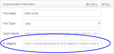 In the Script Execution Parameters pane, enter the name of an R object that is currently in your workspace or one you expect to be generated from the execution into the R Objects field.