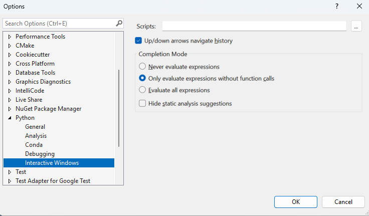 Adjust settings in the Completion Mode group, such as Never evaluate expressions or Hide static analysis suggestions.