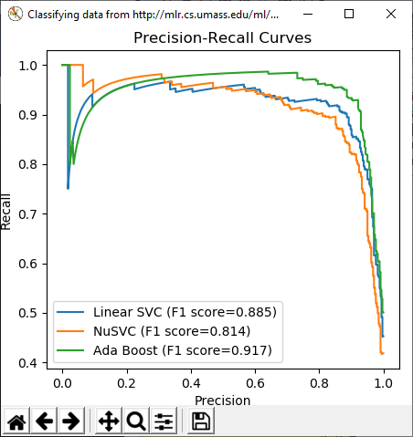 To run the program, select Debug > Start without Debugging or use the keyboard shortcut Ctrl+F5. The program generates a precision-recall curve graph: