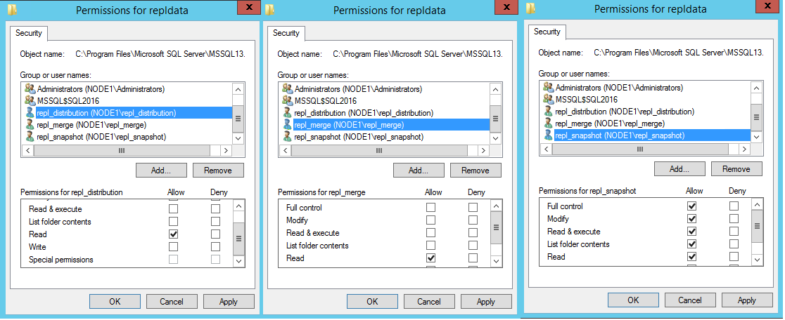 Después de agregar las tres cuentas, asigne los permisos siguientes: