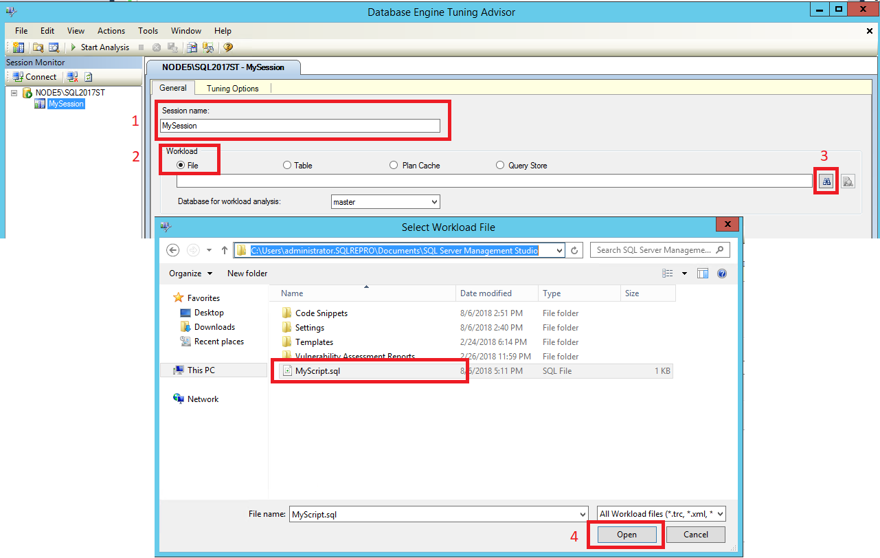 4. Seleccione Archivo para la carga de trabajo y, luego, seleccione el icono de prismáticos para que el usuario Busque un archivo de carga de trabajo. Busque el archivo MyScript.sql que guardó en el paso 1.