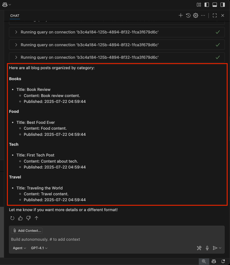 Captura de pantalla del ejemplo mediante una herramienta de agente para conectarse a una base de datos en el chat de GitHub Copilot.