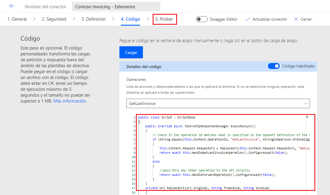 Pegue el siguiente código en el campo Código y seleccione la pestaña Probar.
