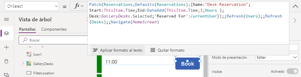 Vaya a la barra de fórmulas y revise la fórmula para OnSelect. Cuando el usuario selecciona la opción Reservar, se utiliza una función Patch() para crear una nueva fila Reserva. Esta nueva fila tiene relaciones con el escritorio y su usuario. La relación de usuario se establece a partir de una variable global que se establece en la aplicación al inicio.