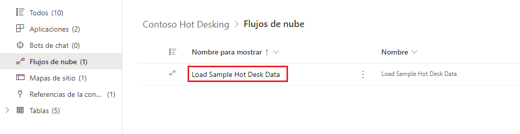 Seleccione Flujos de nube y, luego, seleccione el flujo Load Sample Hot Desk Data para abrirlo.