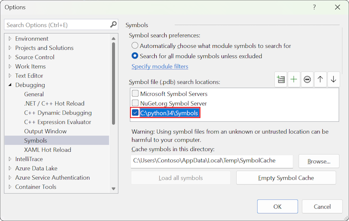Especifique la ubicación donde se encuentra el archivo python.pdb , como c:\python34\Symbols, como se muestra en la siguiente imagen.