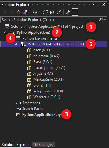 En el nodo Entornos de Python , expanda un nodo de intérprete para ver las bibliotecas instaladas en ese entorno (5).