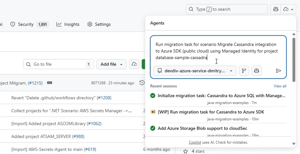 Abra el panel Agentes en la esquina superior derecha y escriba el mensaje. Una vez introducido el aviso, Copilot inicia una nueva sesión y abre una nueva solicitud de extracción, que aparece en la lista debajo del cuadro de aviso. Copilot trabaja en la tarea y, a continuación, le agrega como revisor cuando haya terminado, lo que desencadena una notificación.
