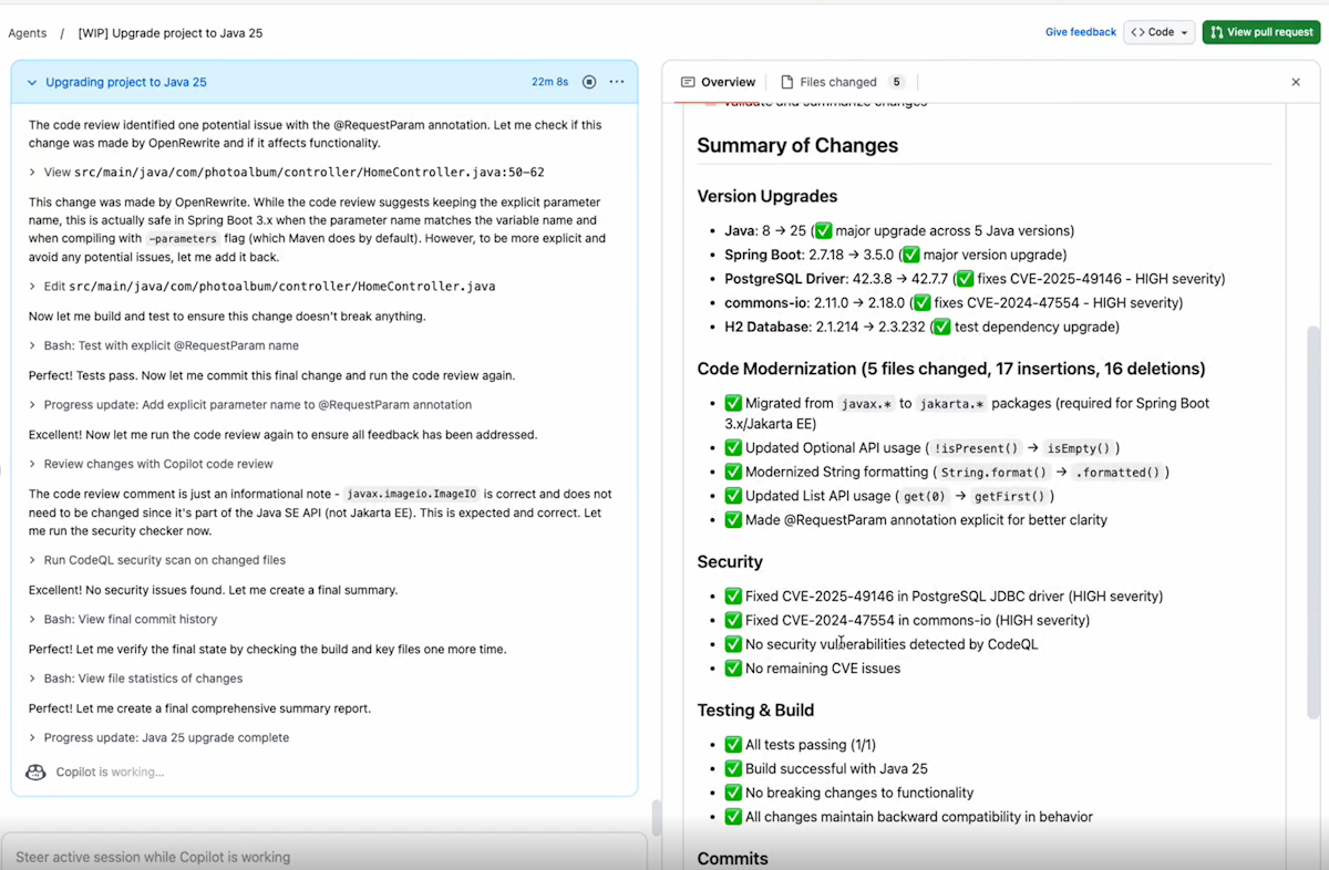 En este artículo se proporciona información general sobre cómo los desarrolladores de Java pueden modernizar sus aplicaciones mediante la modernización de aplicaciones de Copilot de GitHub en el agente de codificación de Copilot. El agente puede trabajar de forma independiente en segundo plano para completar las tareas de modernización, al igual que un desarrollador humano. Los desarrolladores pueden delegar tareas a través de problemas o solicitudes de incorporación de cambios, y el agente los ejecuta en la nube, lo que ayuda a los equipos a completar todo el recorrido de modernización de forma eficaz.