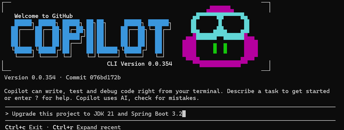 Para actualizar tu aplicación Java a una versión más reciente del entorno de ejecución o del marco, ejecuta el siguiente comando de ejemplo en la interfaz de línea de comandos de Copilot. Este enfoque ayuda a garantizar que el proyecto se alinee con las últimas funcionalidades de la plataforma y las actualizaciones de seguridad.