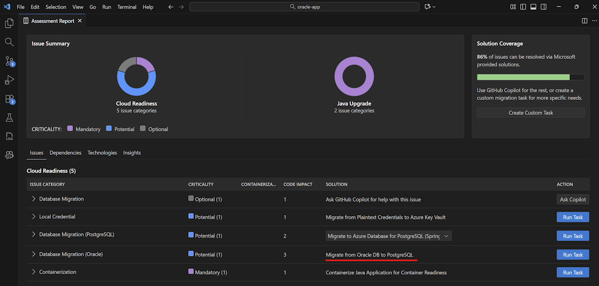 La modernización de aplicaciones copilot de GitHub ahora proporciona una tarea de migración dedicada diseñada para abordar la actualización del cliente de base de datos ( mediante la autenticación de identidad administrada) y la conversión de SQL necesaria para el escenario de migración de Oracle a PostgreSQL.