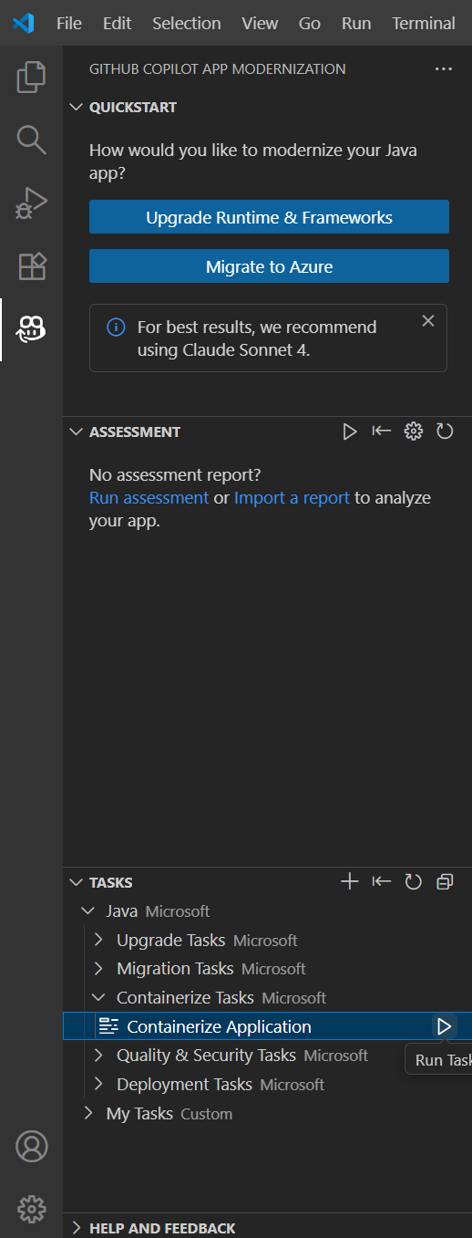 En la sección Tareas, abra Java y, a continuación, abra Tareas de Contenerización y seleccione Contenerizar Aplicación.