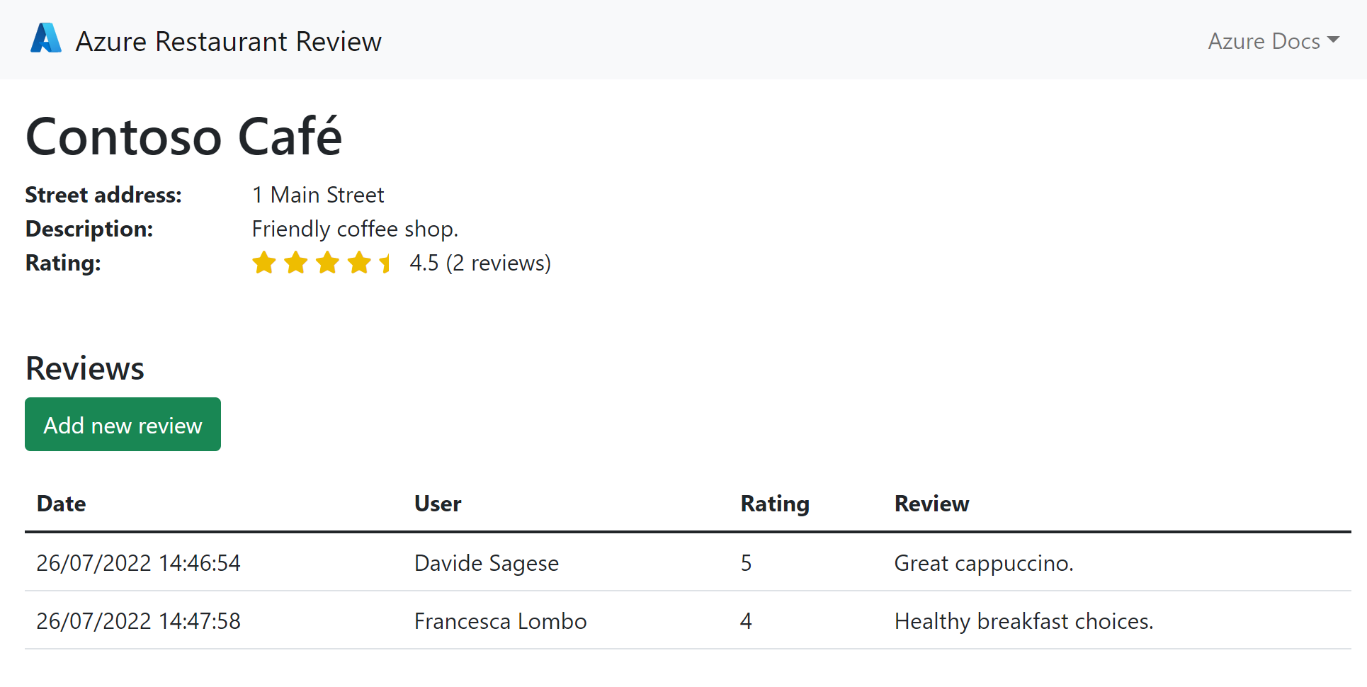 La aplicación de ejemplo Python es una aplicación de revisión de restaurantes que guarda el restaurante y revisa los datos en PostgreSQL. Al final de la serie de tutoriales, tendrá una aplicación de revisión de restaurante implementada y en ejecución en Azure Container Apps que tiene un aspecto similar a la captura de pantalla siguiente.