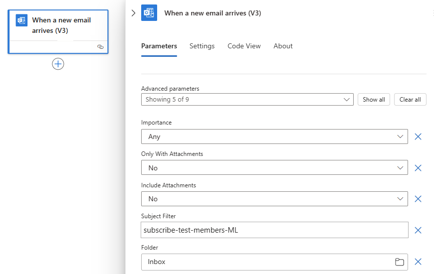 Parámetro Valor Descripción Importancia Cualquiera Especifica el nivel de importancia del correo electrónico que desea. Carpeta Bandeja de entrada La carpeta de correo electrónico para comprobar. Subject Filter (Filtro de asunto) subscribe-test-members-ML Especifica el texto que se va a buscar en el asunto del correo electrónico y filtra los correos electrónicos en función de la línea de asunto. Nota: