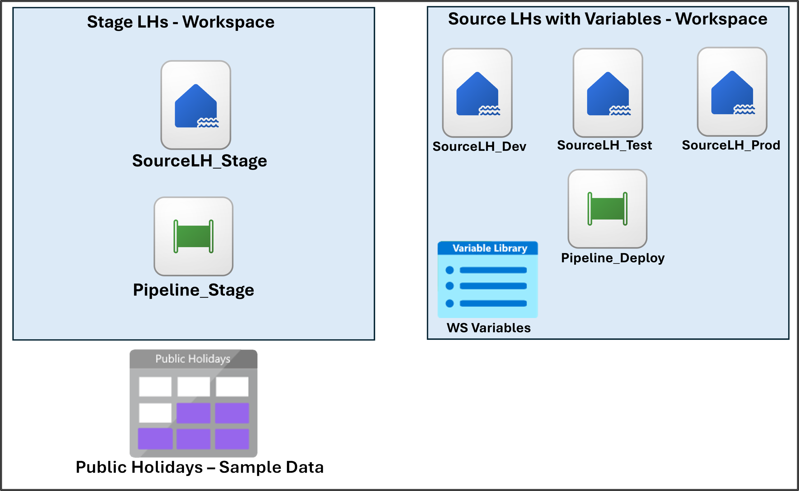 En la barra lateral, seleccione el área de trabajo Source LHs with Variables (LHs de origen con variables ) y asegúrese de que contiene todas las instancias de Lakehouse recién creadas.