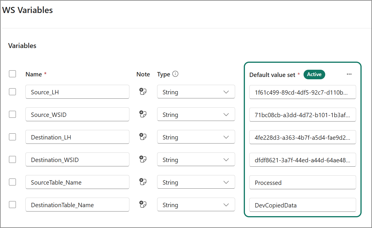 Nombre Tipo Conjunto de valores predeterminado Source_LHCuerda <GUID de SourceLH_Dev lakehouse> Source_WSIDCuerda <GUID del área de trabajo de SourceLH_Dev> Destination_LHCuerda <GUID de SourceLH_Test lakehouse> Destination_WSIDCuerda <GUID del área de trabajo de SourceLH_Test> SourceTable_NameCuerda DevCopiedDataDestinationTable_NameCuerda TestCopiedDataSeleccione Guardar>acuerdo.