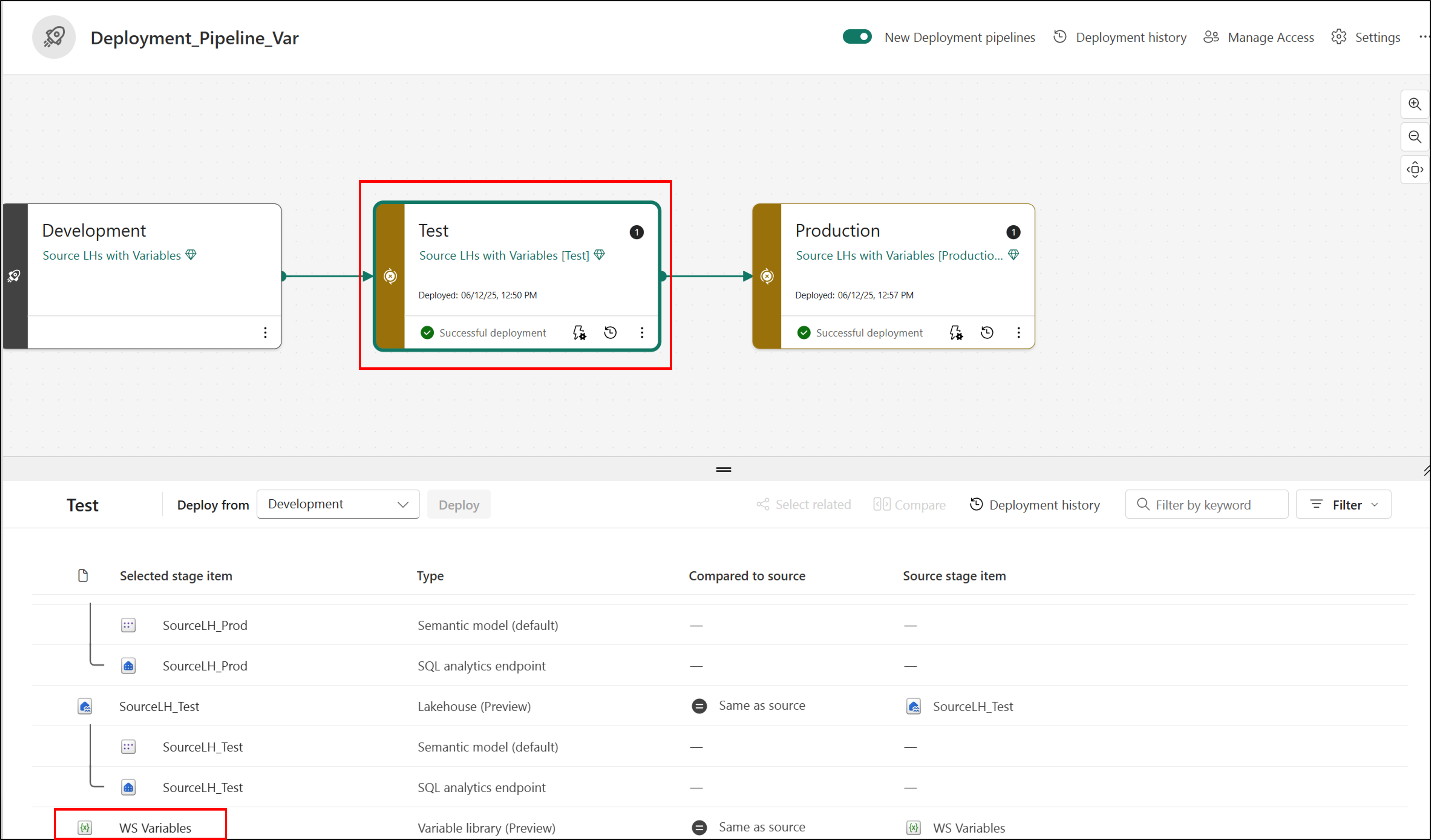 Repita los pasos anteriores para el SourceLH_Dev y SourceLH_Test lakehouses en el área de trabajo LHs de origen con variables .