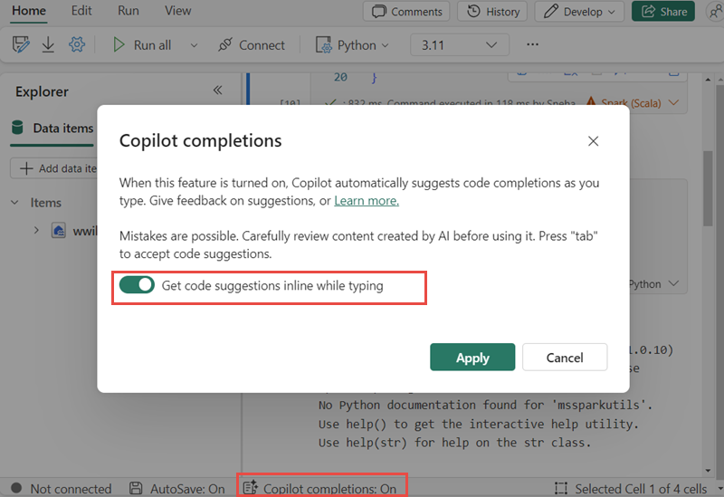 Pylance, un servidor de lenguaje eficaz y enriquecido con características, ahora está disponible en el cuaderno Fabric. Pylance facilita el desarrollo de Python con finalizaciones inteligentes, mejor detección de errores e información de código mejorada. Entre las mejoras clave se incluyen autocompletar más inteligente, compatibilidad con lambda mejorada, sugerencias de parámetros, información de desplazamiento mejorada, mejor representación de docstring y resaltado de errores. Con Pylance, escribir código de Python y PySpark se vuelve más rápido, más preciso y eficaz.